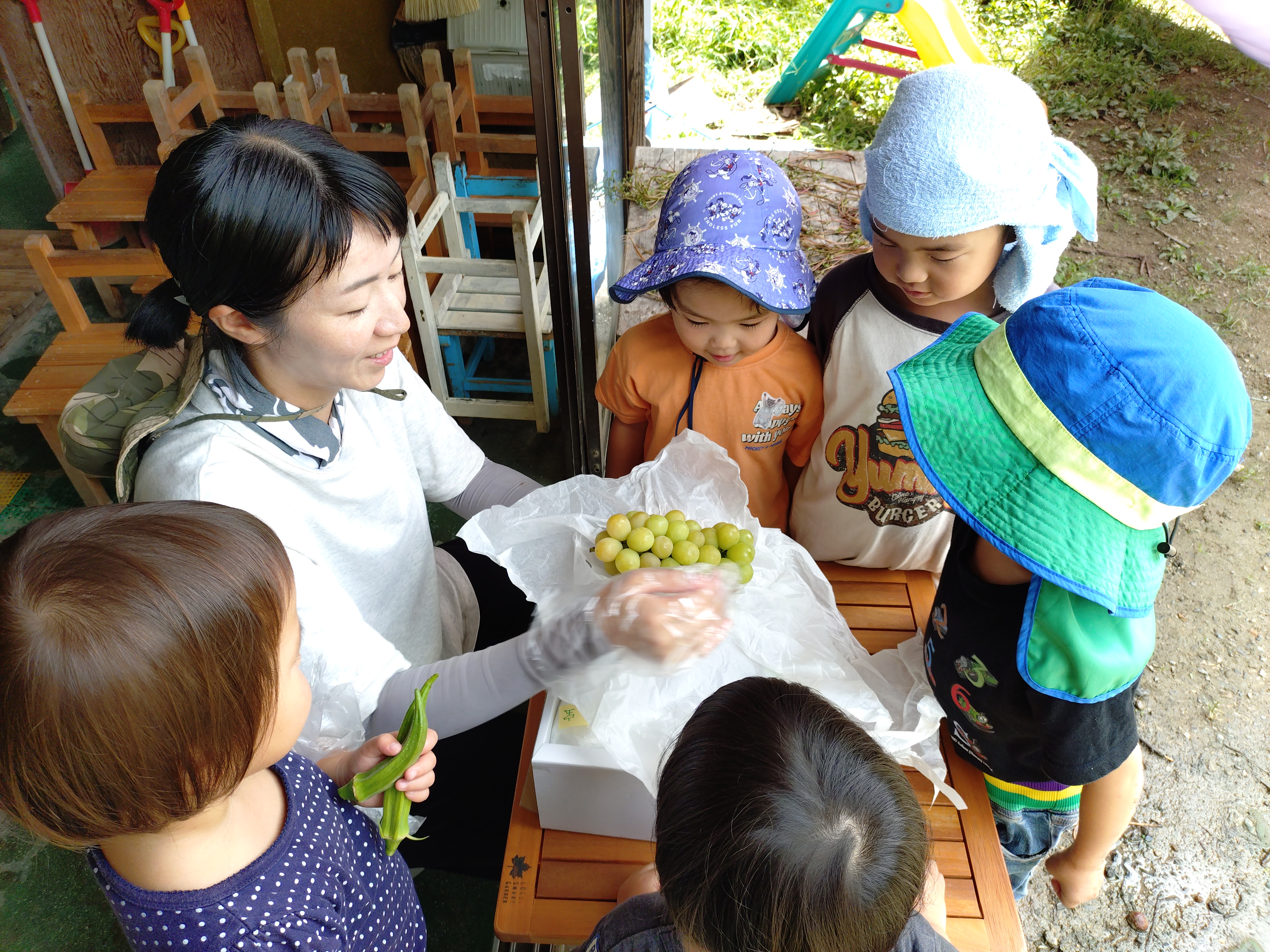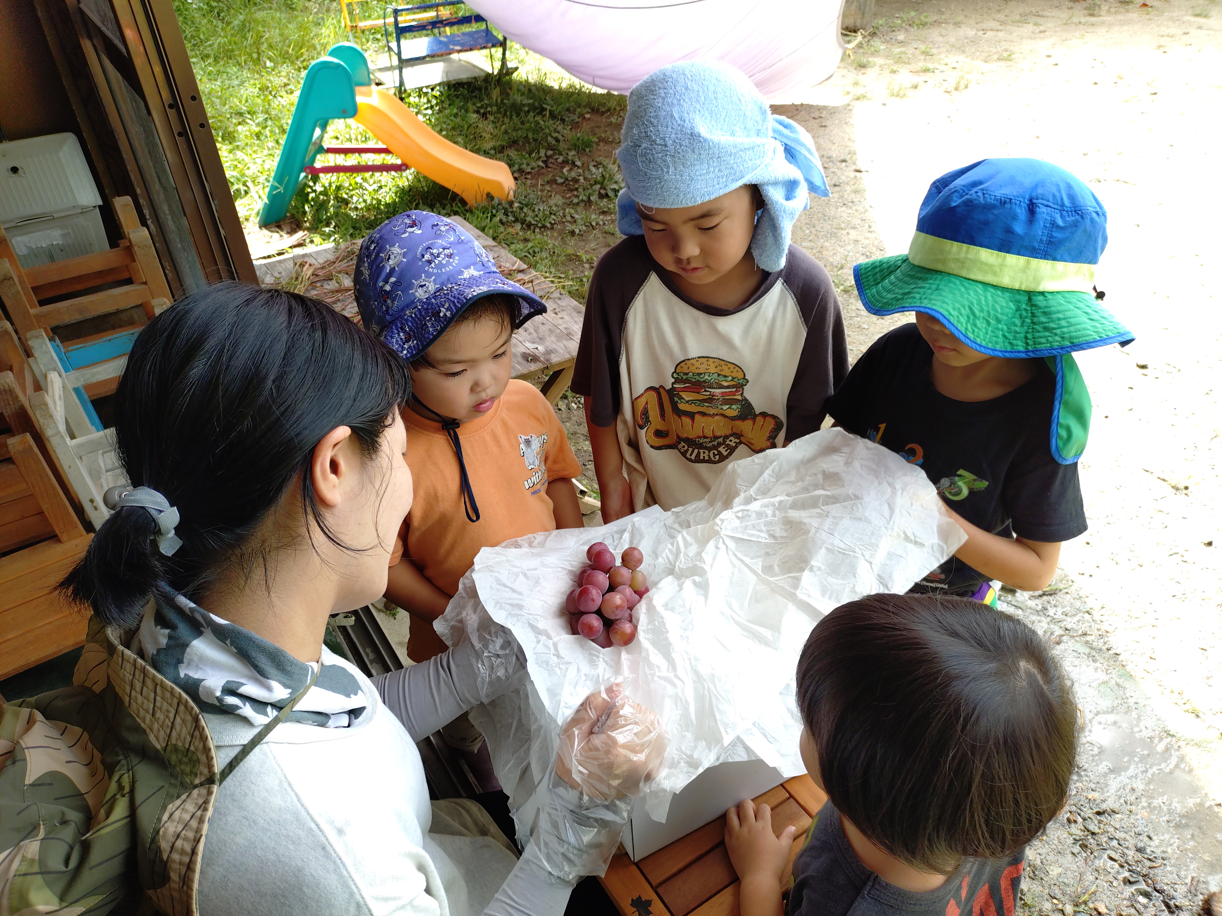 保育者がひとつずつ開くたびに「今度は何色のぶどうかな??」とわくわく見守る子どもたち😆