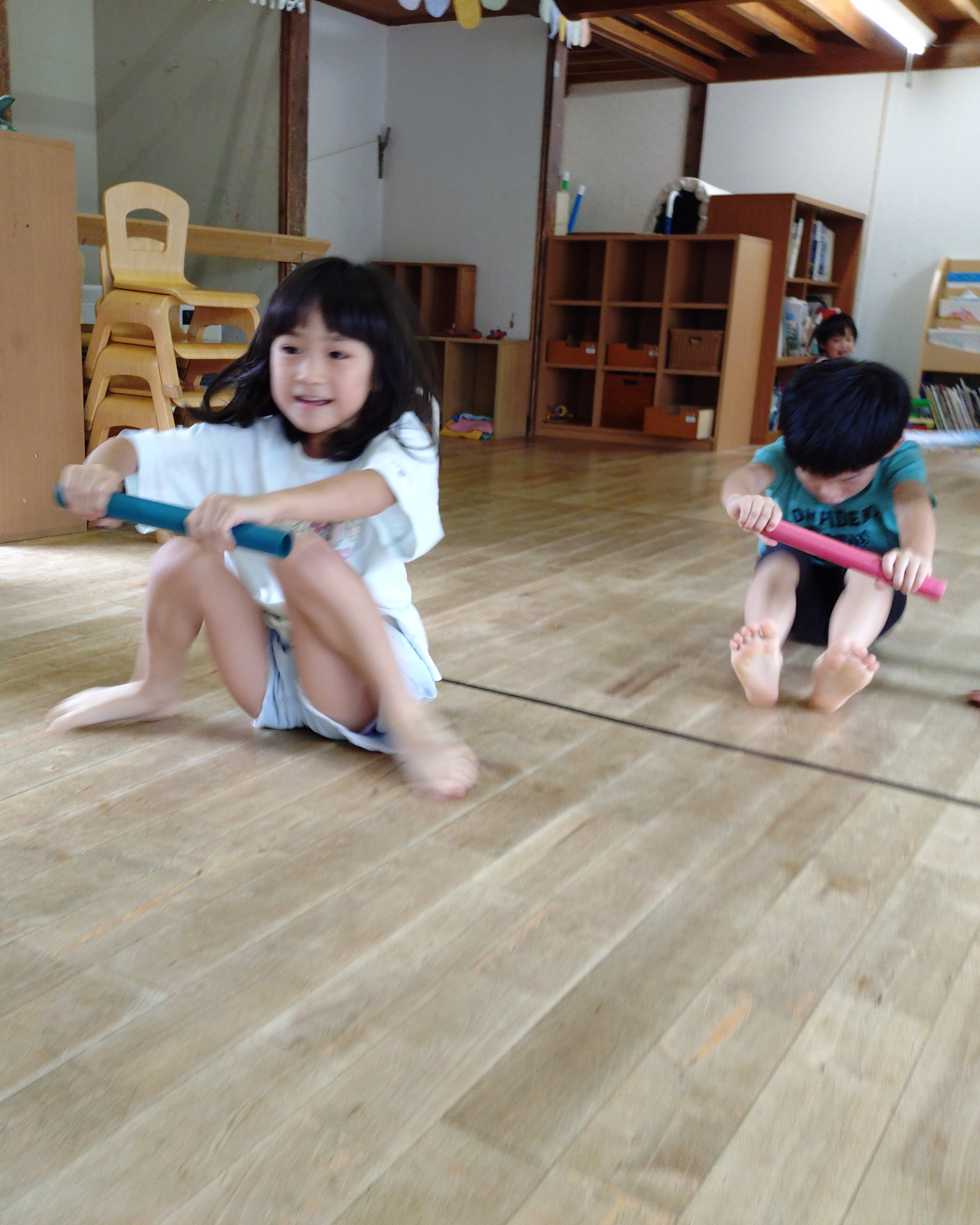 室内で行ったので、バトンを船のオールに見立てて船のリレー対決をしてみました♬