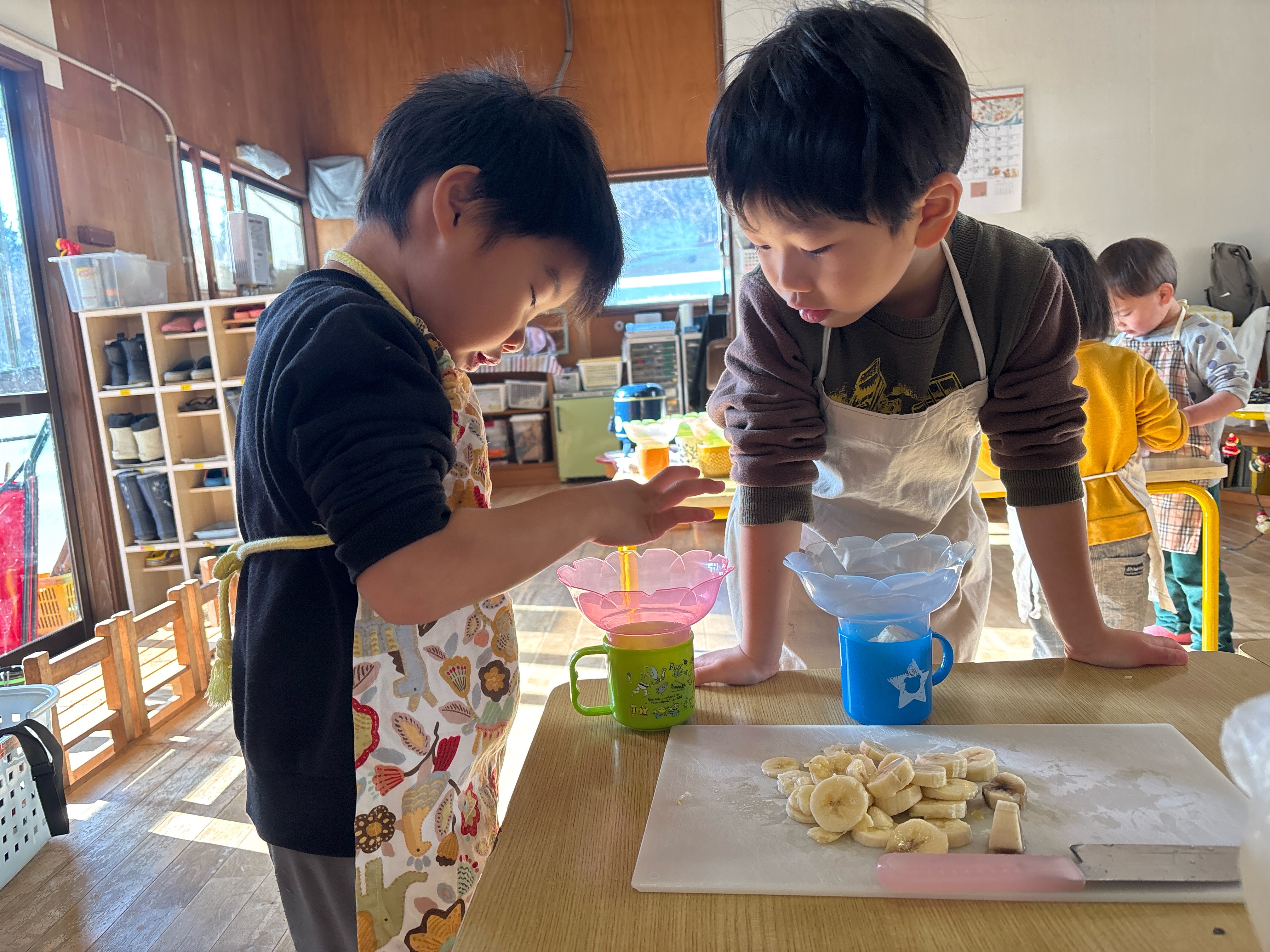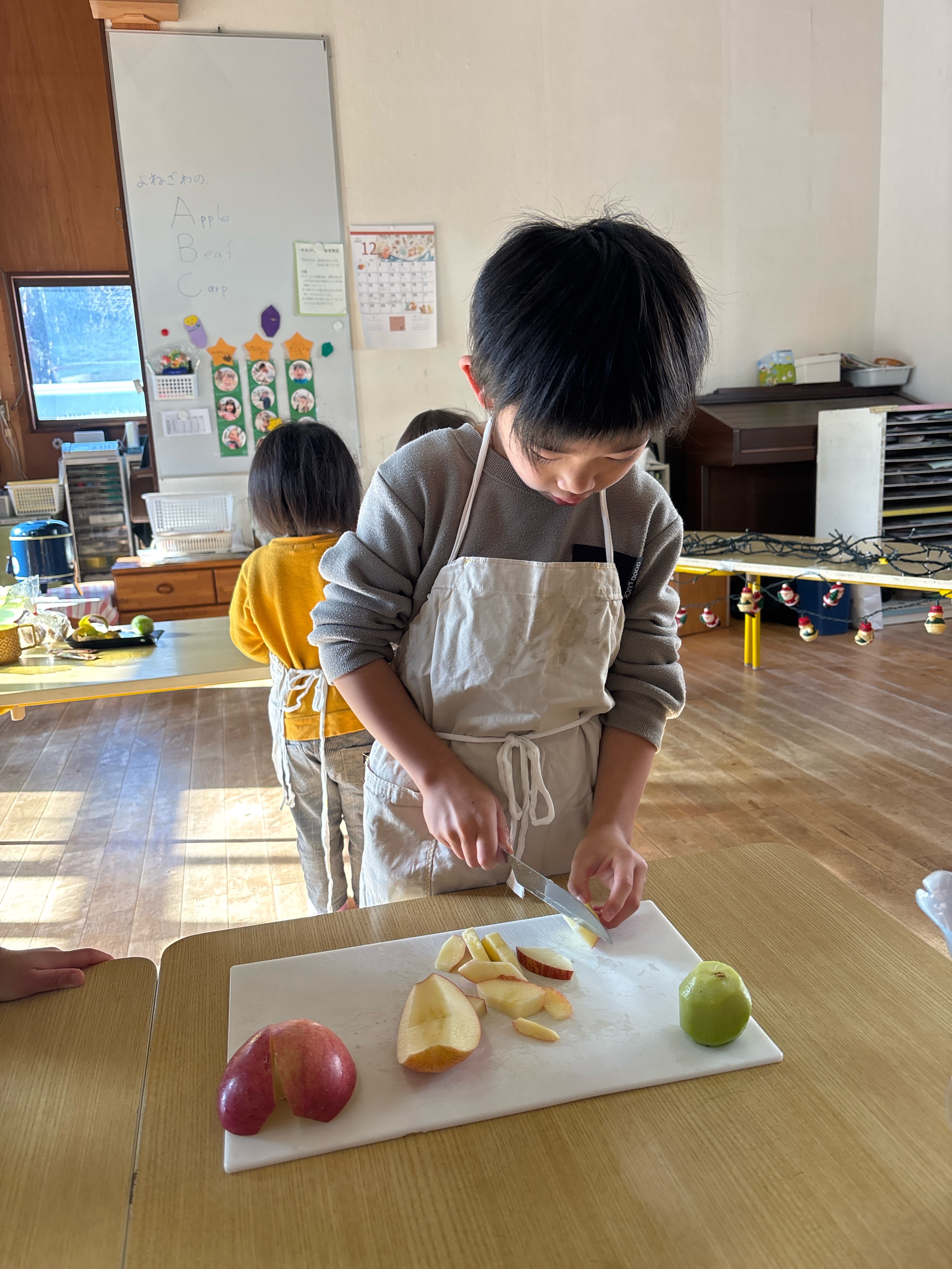年長さんはりんご、年中・年少さんはバナナとキウイを切りました!