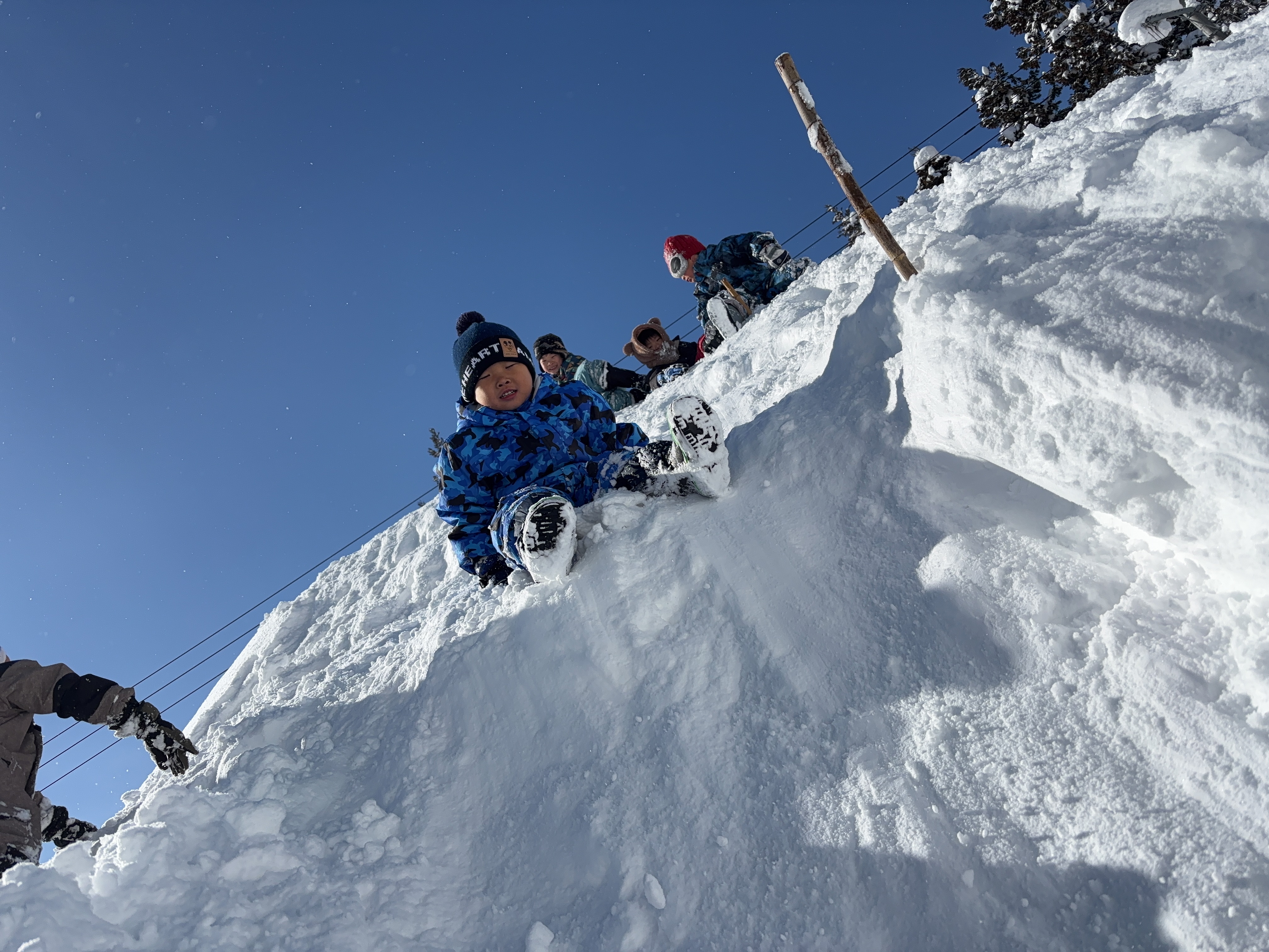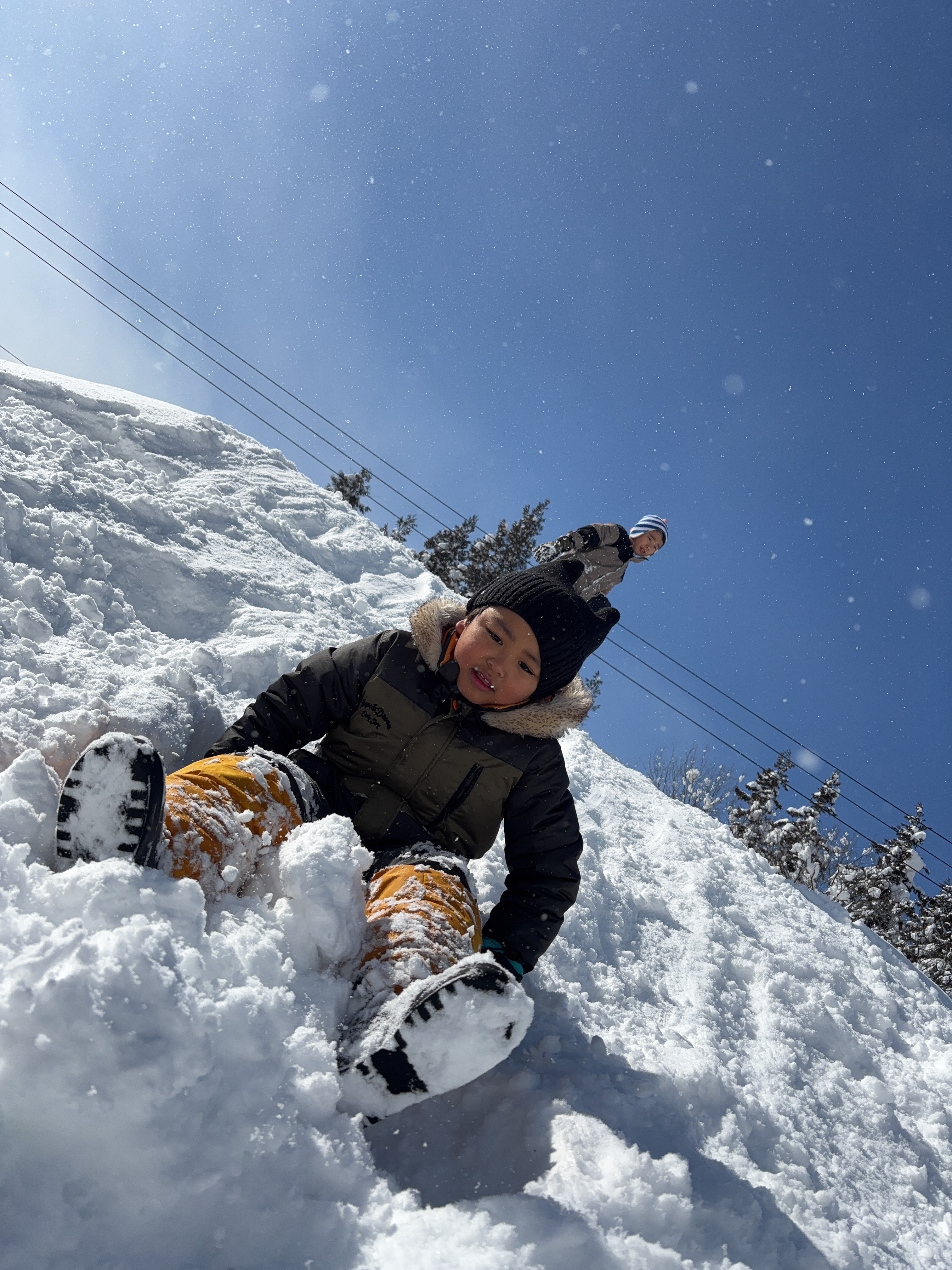 雪質を見て、そり遊びをしたりお尻滑りに変更したりと、遊びを変化させる子どもたちです😊