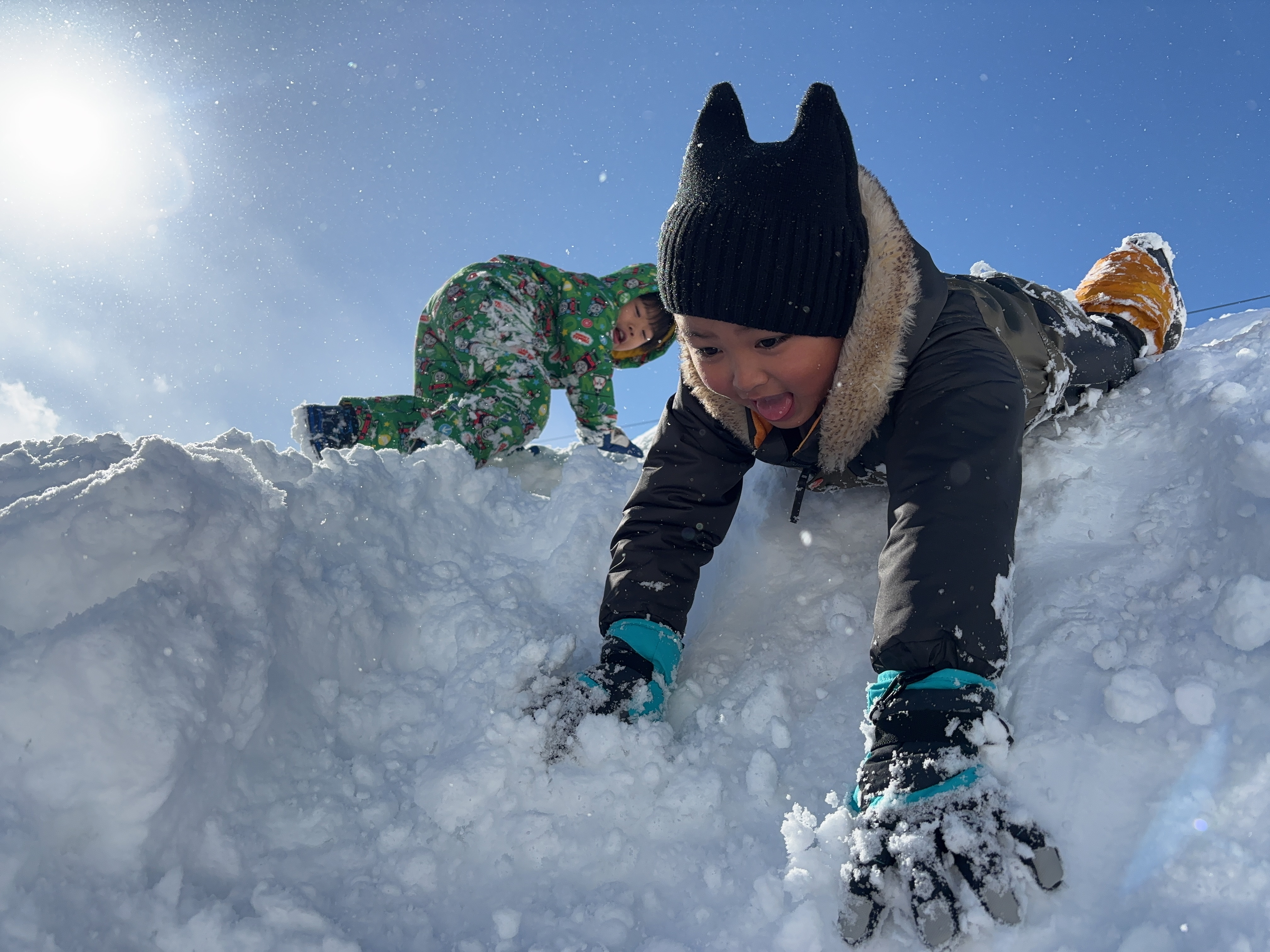 自分より大きな雪玉をお友だちと力を合わせて転がしています😆✨