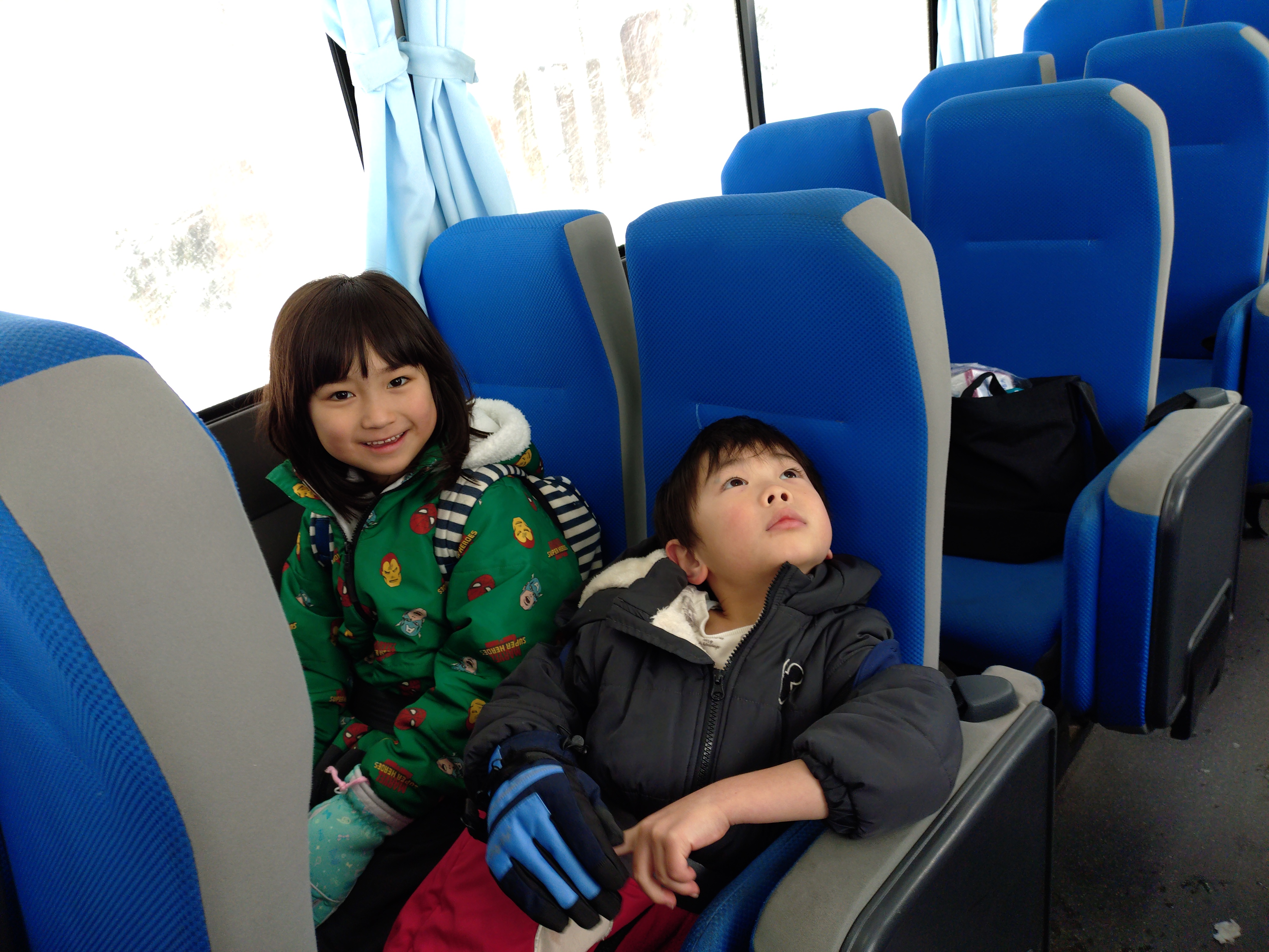 毎日、園バスに乗っている子どもたち。この日は自然の家のバスに乗りキョロキョロ・・・