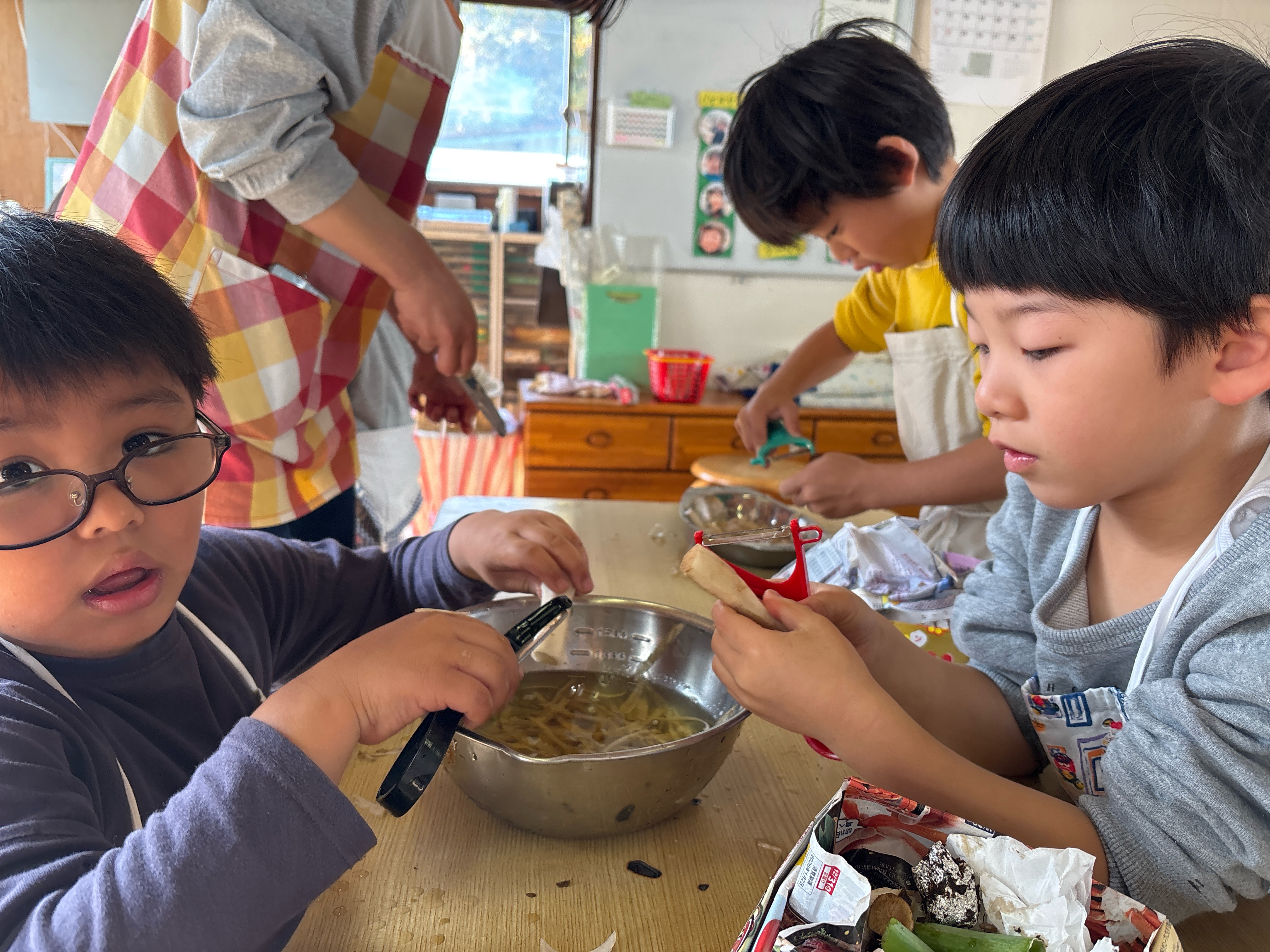 その後もネギ、こんにゃく、まいたけ、ごぼうと様々な食材の下処理にチャレンジ✨