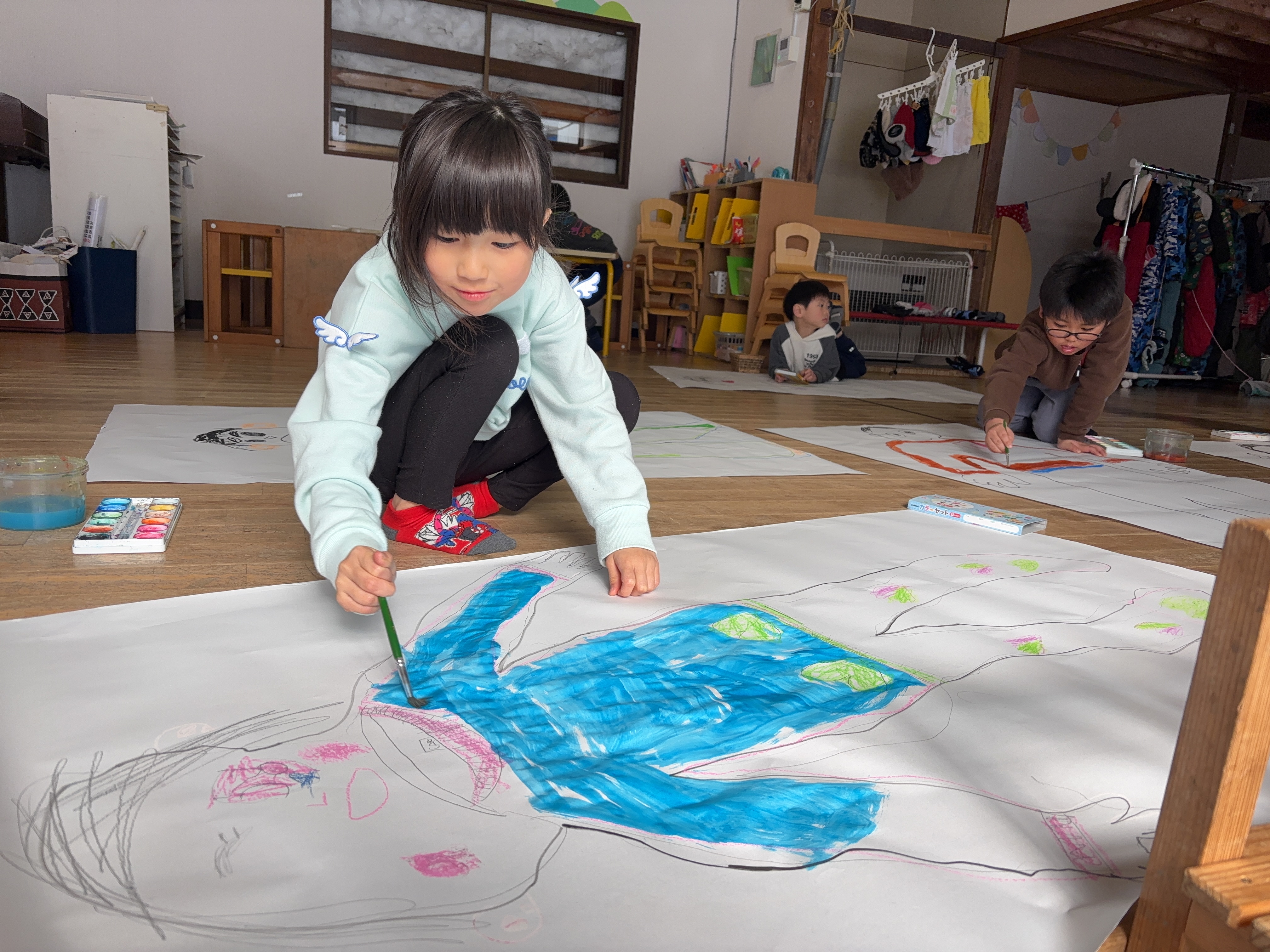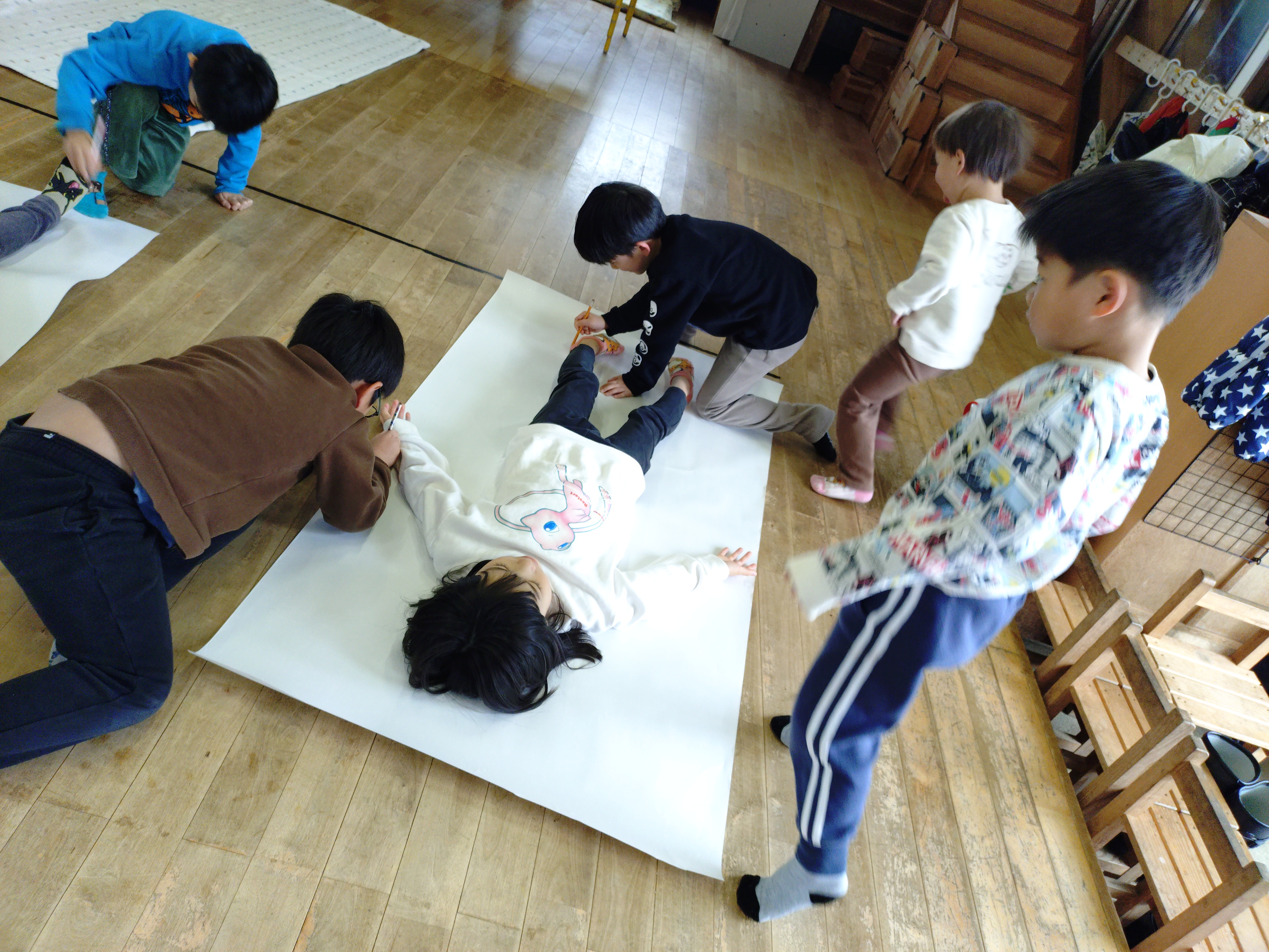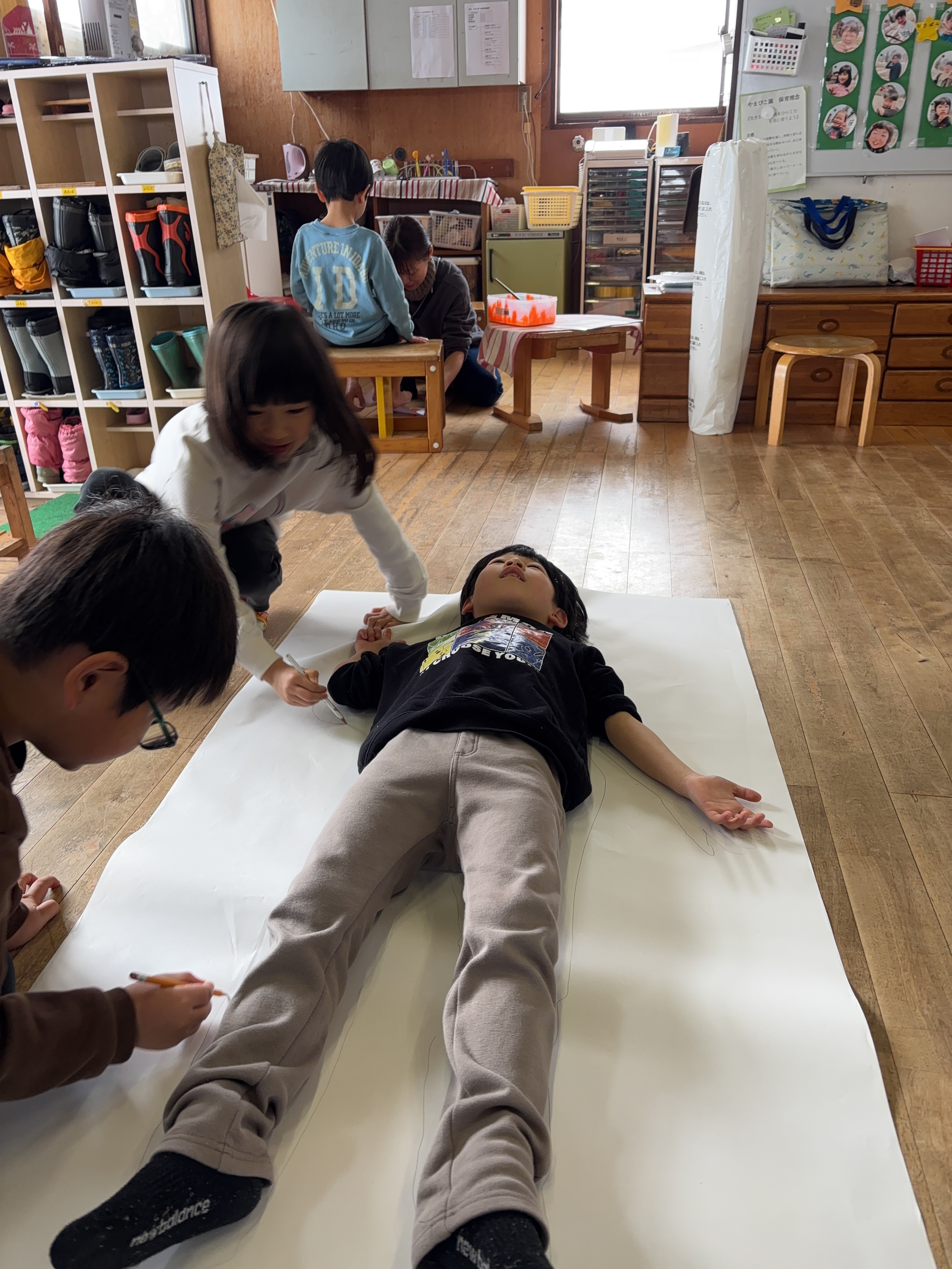 年長さんが毎年取り組んでいる“等身大の絵”。いよいよ自分もできるんだと嬉しそうな子どもたち。