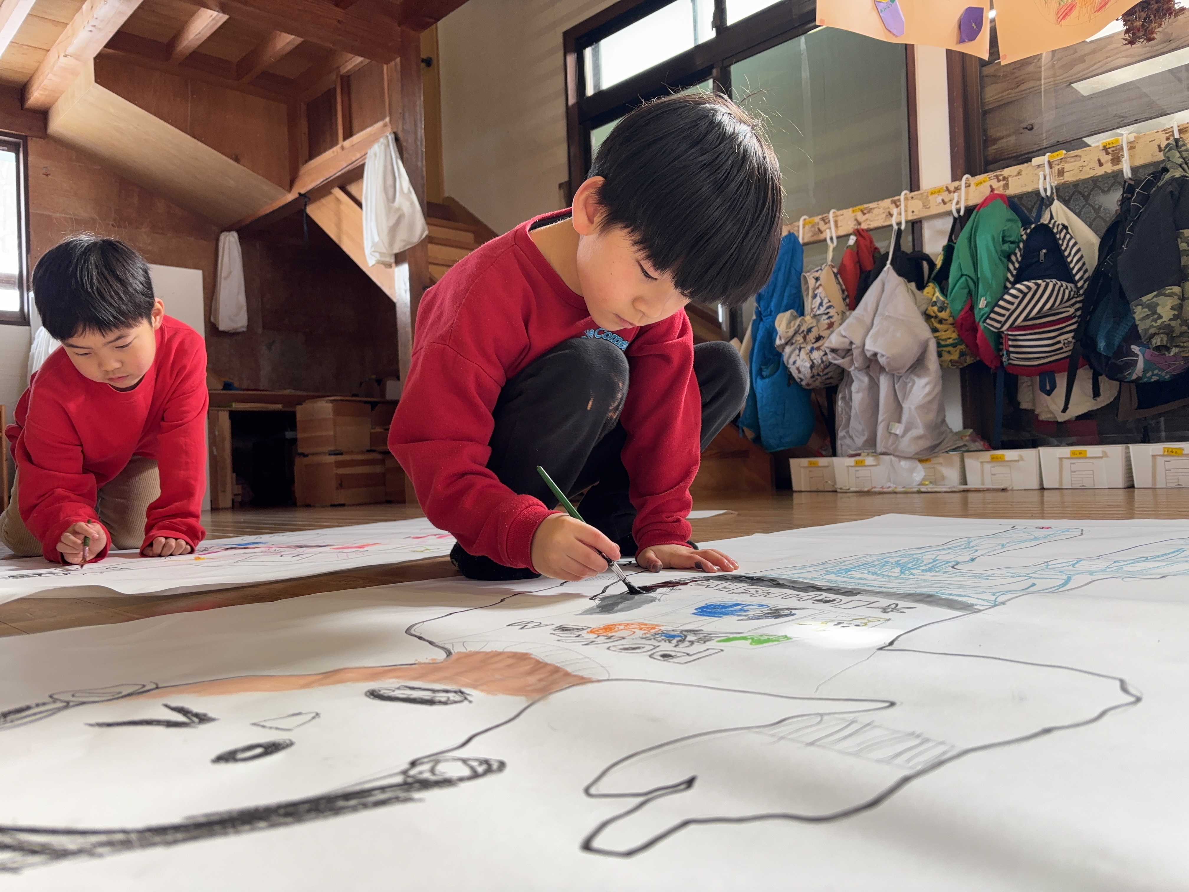 大きな紙に一生懸命向かう子どもたちでした。